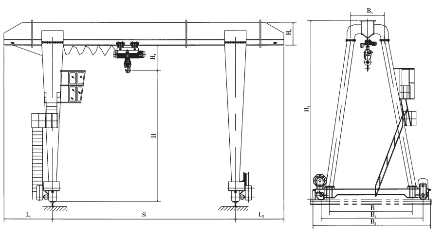 1、 MH型電動葫蘆門式起重機(jī)與CD1、MD1等型號的電動葫蘆配套使用,是一種有軌運行的中小型起重機(jī)。