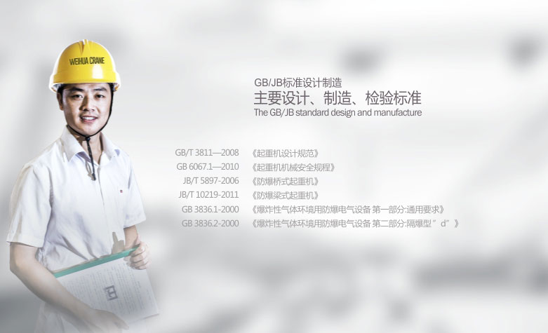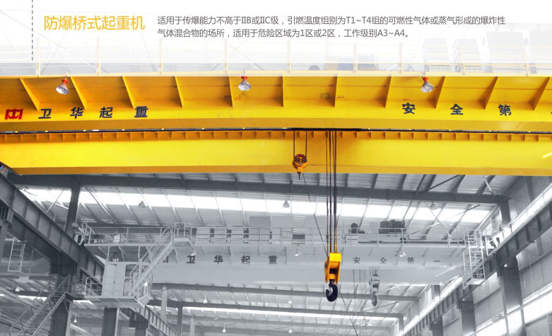 1、   QB型防爆吊鉤橋式起重機(jī)所有電機(jī)、電器防爆性能符合GB3836.2-2000《爆炸性氣體環(huán)境用防爆電氣設(shè)備第2部分:隔爆型“d”》,整機(jī)性能符合JB/T5897-2006《防爆橋式起重機(jī)》標(biāo)準(zhǔn)之規(guī)定,經(jīng)國(guó)家指定的防爆產(chǎn)品檢驗(yàn)單位檢驗(yàn)合同,取得了《防爆合格證》。防爆標(biāo)志分別為ExdⅡBT4、ExdⅡCT4。