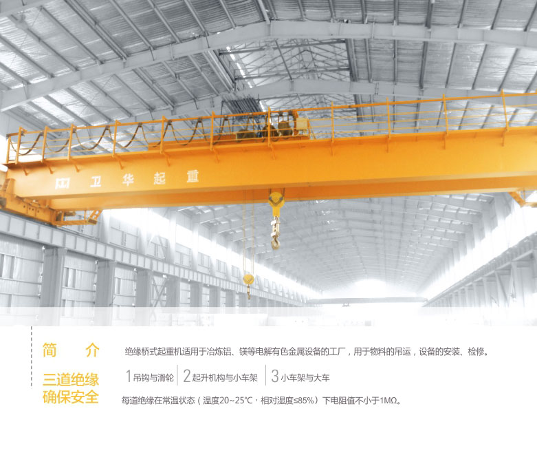 1、QY型絕緣吊鉤橋式起重機(jī)適用于有色金屬電解鋁、鎂、鉛、鋅等冶煉車間。